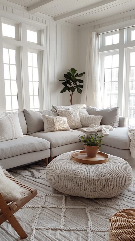 This Scandinavian-inspired cozy living room embraces simplicity and comfort. The space features a large, light gray sectional sofa adorned with a variety of textured, neutral-toned pillows, creating a welcoming and soft seating area. A knitted pouf serves as both a coffee table and additional seating, adding to the room’s relaxed vibe. The room is brightened by large windows that let in natural light, highlighting the white wooden walls and ceiling. A few carefully placed plants and a natural fiber rug complete the look, enhancing the room’s organic and serene atmosphere.