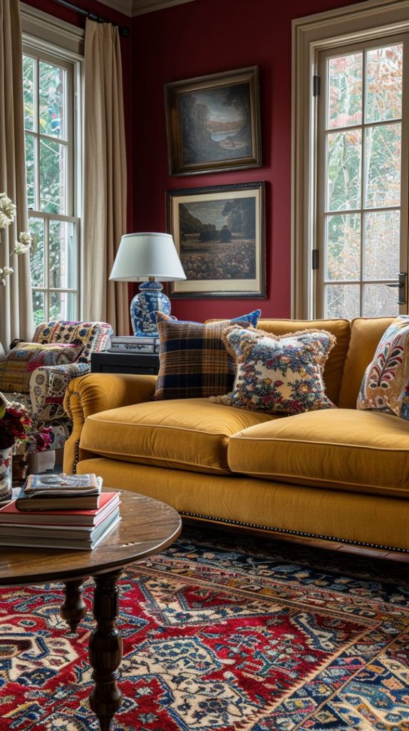This cozy living room features a bold and inviting design with deep red walls that create a warm and intimate atmosphere. The mustard-yellow sofa serves as a focal point, adorned with patterned throw pillows that add texture and visual interest. A richly colored, intricate area rug ties the room together, echoing the color palette with its detailed design. The room is complemented by classic framed artwork and a mix of traditional furnishings, including a wooden coffee table and a blue and white table lamp. Natural light streams in through the large windows, enhancing the room’s vibrant and welcoming ambiance.