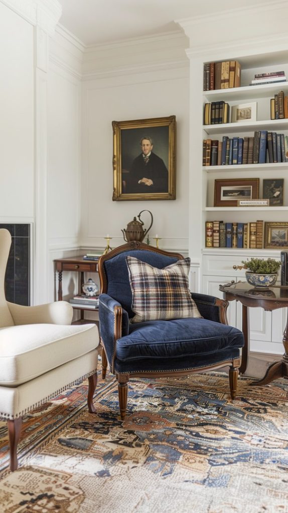 This cozy living room exudes elegance and tradition with its classic decor and sophisticated touches. The room features a warm color palette with cream and navy blue armchairs that provide a comfortable seating area. A large, richly patterned area rug adds depth and texture, complementing the wooden furniture and white built-in bookshelves filled with an array of books and decorative items. The fireplace is a central focal point, adorned with a traditional portrait and flanked by elegant decor. The overall ambiance is inviting and refined, perfect for a relaxing and cozy environment.