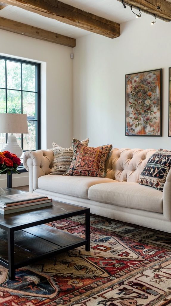 This cozy living room blends rustic charm with elegant touches, creating a welcoming and stylish space. The room features a beige tufted sofa adorned with patterned throw pillows, adding a pop of color and texture. The wooden beams on the ceiling and the large window with black frames provide a rustic yet contemporary feel. A richly patterned area rug complements the decor, and a dark wood coffee table adds a solid, grounding element. Floral artwork on the walls enhances the room’s elegance, making it a perfect blend of comfort and sophistication.