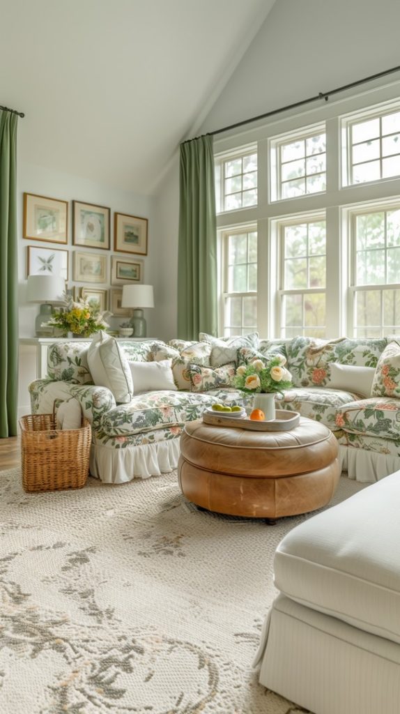 This cozy living room exudes floral elegance with its beautifully upholstered sofa featuring a delightful botanical print. The room is bathed in natural light from large windows adorned with soft green curtains that add a touch of freshness. The beige and white area rug complements the floral theme, providing a neutral base that balances the vibrant patterns. A round, leather ottoman in the center adds a warm, rustic touch and serves as a versatile piece for seating or as a coffee table. The decor is completed with a gallery wall of framed botanical prints and a wicker basket, enhancing the room’s cozy and inviting atmosphere.