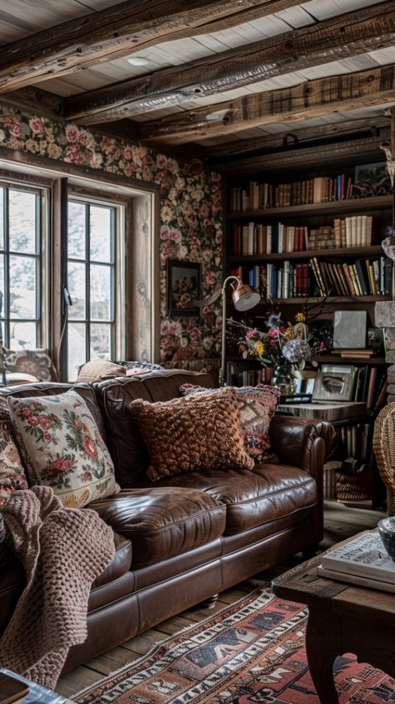 This cozy living room exudes rustic charm with its rich, dark leather sofa adorned with plush, textured pillows and a knitted throw. The floral wallpaper adds a touch of vintage elegance, complemented by the wooden beams on the ceiling, which enhance the room’s warm and inviting atmosphere. A colorful, patterned area rug anchors the space, adding a vibrant touch to the earthy tones. The room is filled with personal touches, from the filled bookshelves to the eclectic mix of decor items, creating a space that feels both lived-in and well-loved. The large windows bring in natural light, balancing the darker elements and making the room feel cozy yet open.