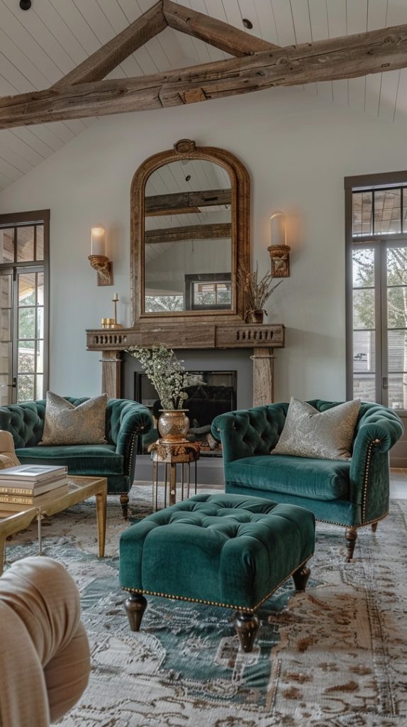 This elegant living room combines rustic elements with luxurious details, creating a space that is both inviting and refined. The rich green velvet tufted chairs and ottoman add a touch of opulence, while the wooden beams and vintage mirror above the fireplace introduce a rustic charm. The soft, neutral walls and ample natural light from the large windows enhance the room’s airy feel. Thoughtfully placed decor items, such as the vases and gold accents, bring a cohesive look to the space, making it a perfect blend of comfort and sophistication.