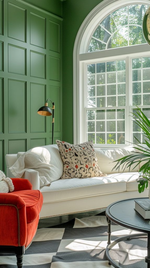 This inviting reading nook features a bold green paneled wall that adds depth and character to the space. The large arched window allows natural light to flood the room, creating a bright and cheerful atmosphere. A comfortable white sofa is adorned with a textured throw pillow, providing a cozy spot for relaxation. The vibrant red armchair introduces a pop of color and complements the green walls beautifully. A black floor lamp and round coffee table complete the setting, making it an ideal corner for reading and unwinding.