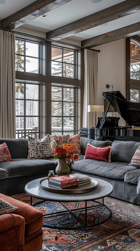 This cozy music room features a plush, dark gray sectional sofa adorned with vibrant throw pillows, creating an inviting and comfortable seating area. A round coffee table with a sleek design sits at the center, holding books and a vase of fresh flowers that add a touch of color and life to the space. The large windows with wooden frames and exposed beams offer breathtaking views of a snowy mountain landscape, bringing the beauty of nature indoors. A grand piano in the corner highlights the room’s musical theme, making it a perfect spot for relaxation and creativity.