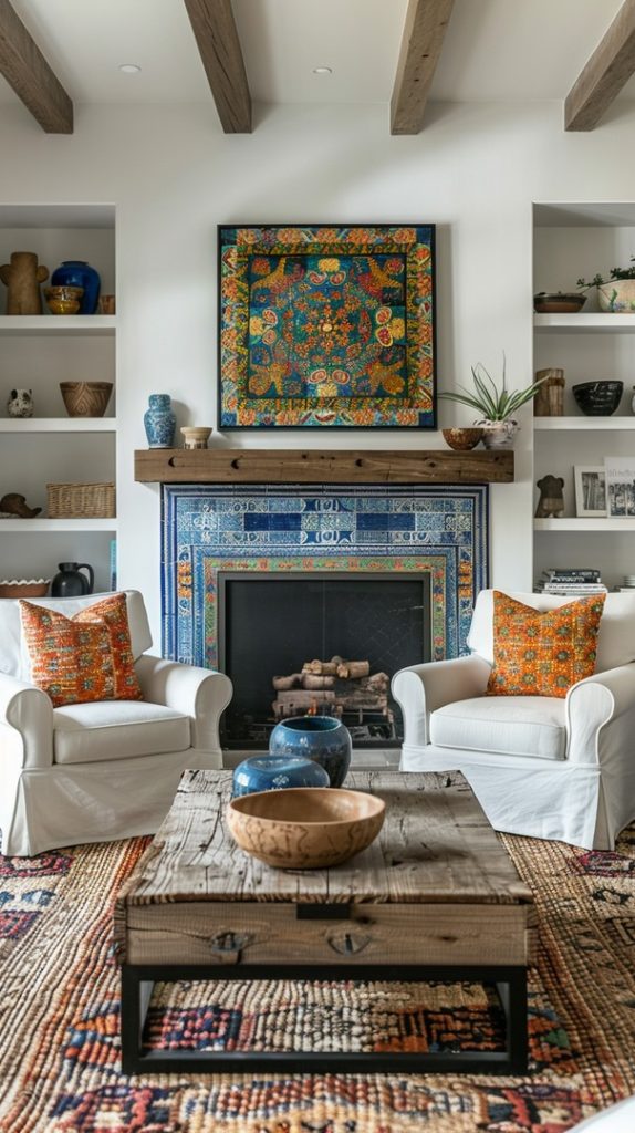 This cozy living room exudes warmth and charm with its vibrant and eclectic decor. The focal point is a beautifully tiled fireplace adorned with intricate blue patterns and a colorful piece of artwork above. Two white armchairs with bright, patterned pillows provide a comfortable seating area around a rustic wooden coffee table, which holds an assortment of decorative bowls. The room’s earthy tones are complemented by the exposed wooden beams on the ceiling and the richly colored rug that adds texture and warmth. Shelves on either side of the fireplace display a mix of pottery and decor items, adding to the room’s inviting and curated feel.