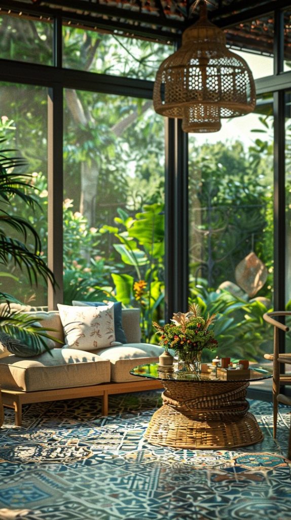 This cozy sunroom exudes tropical charm with its abundance of natural light streaming through large, black-framed windows. The space is decorated with lush green plants that bring the outdoors in, creating a serene and refreshing atmosphere. A comfortable rattan sofa with plush cushions is perfect for lounging, while a matching rattan table set provides an ideal spot for casual dining or enjoying a cup of coffee. The patterned tile floor adds a touch of artistic flair, and a large woven pendant light hanging from the ceiling enhances the room’s warm and inviting ambiance. This sunroom is a perfect retreat for relaxation and connection with nature.