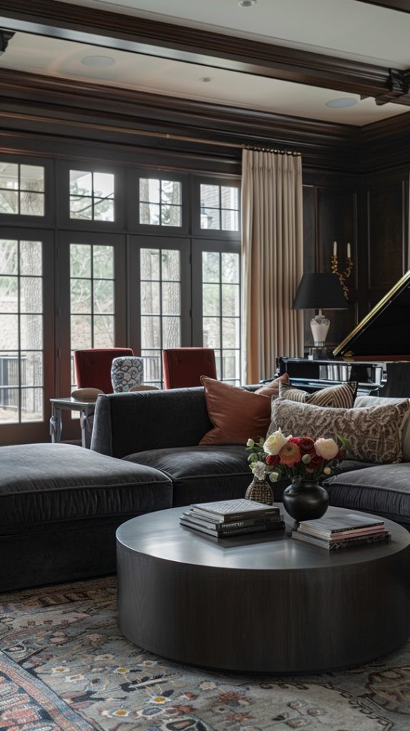 This cozy living room combines elegance and warmth, featuring dark wooden paneling and large windows that allow ample natural light to fill the space. The focal point is a grand piano, adding a touch of luxury and a welcoming atmosphere. The seating area includes a comfortable, dark gray sectional adorned with an assortment of textured and colorful pillows, inviting relaxation. A round coffee table with a sleek design is topped with a vase of fresh flowers and a stack of books, enhancing the room’s inviting ambiance. The background features tall, cream-colored curtains and a black lamp with a decorative base, contributing to the room’s cozy yet sophisticated charm.