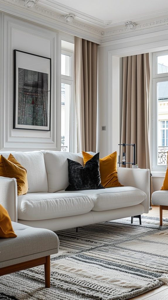 This living room combines elegance and coziness with its sophisticated design and comfortable furnishings. The white sofa and armchairs create a clean and inviting seating area, accented by plush mustard yellow and black throw pillows that add a pop of color. The room features large windows draped with neutral beige curtains, allowing ample natural light to illuminate the space. A textured, patterned rug anchors the seating area, providing warmth and a touch of contemporary style. The walls are adorned with detailed molding, enhancing the room’s classic appeal, while a modern framed artwork adds a chic, artistic element. This living room is perfect for relaxing and entertaining in a stylish and cozy environment.