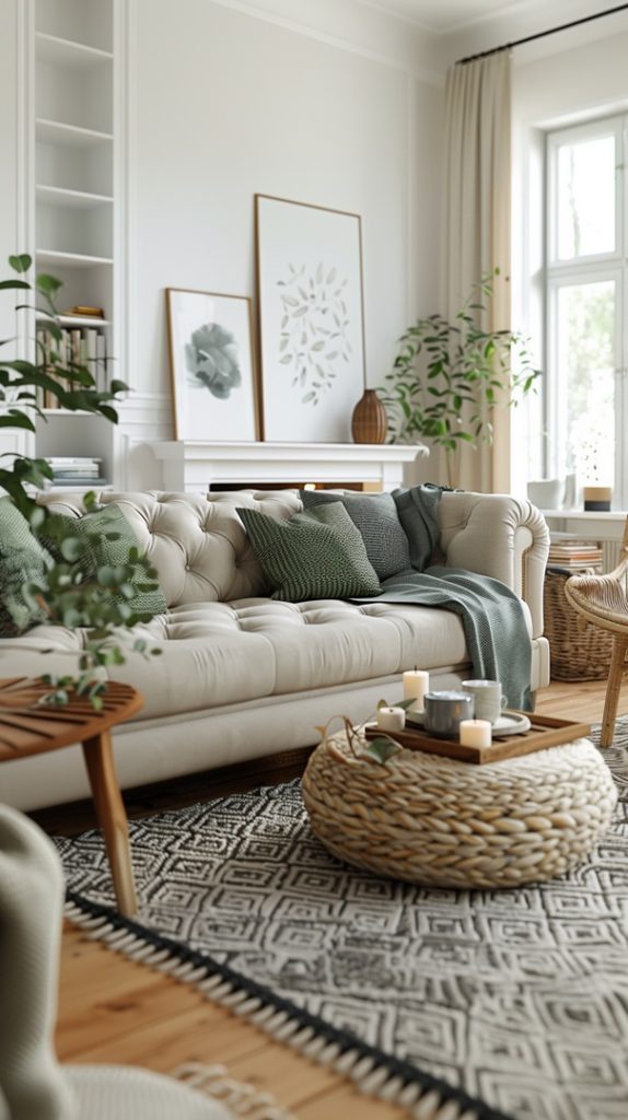 Embrace a serene and cozy ambiance with this inviting living room. Featuring a soft gray sofa adorned with green and textured pillows, the space is perfect for relaxation. The rustic wooden mantel above the white brick fireplace adds a charming touch. A woven coffee table holds candles and fresh eucalyptus, enhancing the room’s natural feel. Large windows bring in abundant light, while a cozy reading nook with a daybed and soft blankets completes this tranquil retreat.