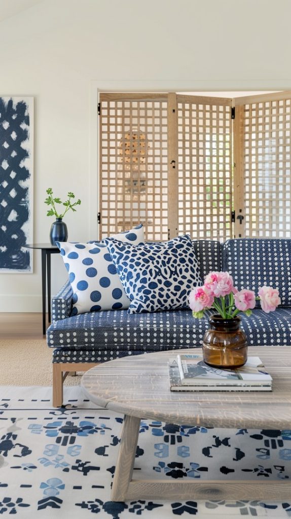 This modern living room is both cozy and vibrant, featuring a bold mix of patterns and colors. The focal point is a polka-dotted sofa adorned with an array of colorful throw pillows, including deep blue and burnt orange hues that add warmth and contrast. A simple, round wooden coffee table with black legs complements the space, holding a decorative amber vase with fresh pink flowers, enhancing the room’s welcoming atmosphere. The background features a wooden slat wall adding texture and warmth, alongside a striking abstract art piece that brings an artistic touch to the decor. This living room balances comfort with contemporary style, making it an inviting space for relaxation and socializing.