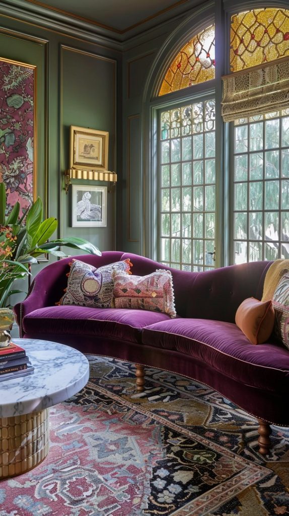 This luxurious living room exudes a rich, heritage charm with its opulent decor and timeless style. A striking purple velvet sofa adorned with eclectic pillows serves as the centerpiece, perfectly complemented by the deep green paneled walls and intricate moldings. The arched windows, framed by stained glass and lace shades, allow natural light to flood the room, highlighting the vibrant patterns and textures of the rug and marble-topped coffee table. Artwork and gold accents on the walls add an extra layer of sophistication, making this room a perfect blend of classic elegance and modern comfort.