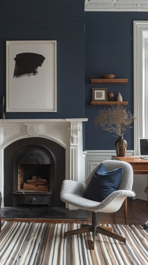 This cozy living room combines sophistication and comfort with deep blue walls and a white fireplace. A modern armchair and minimalist artwork create a serene atmosphere. Wooden elements, including a desk and shelves, add warmth, while a striped rug grounds the space in coziness.