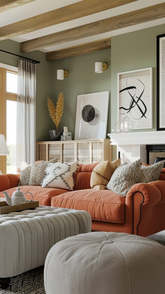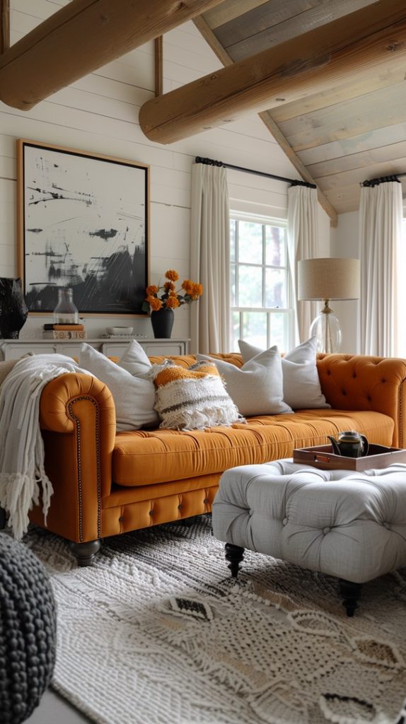 Experience rustic charm in this cozy loft living room. An orange chesterfield sofa paired with neutral pillows and a chunky knit throw invites relaxation. Wooden beams and white walls enhance the airy feel, while a plush ottoman and decorative elements add a touch of elegance.