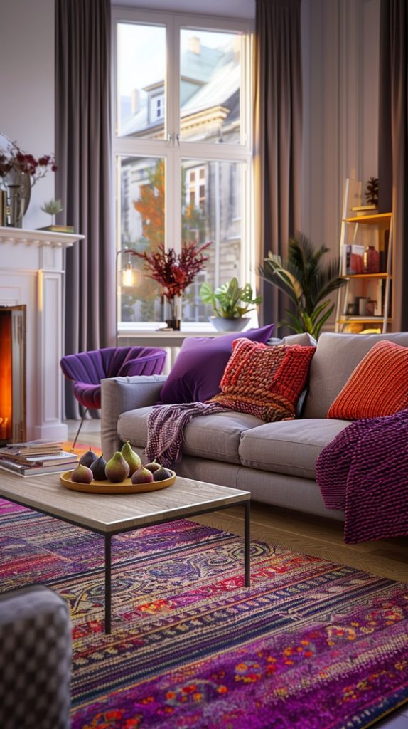 Infuse vibrancy into your living space with rich purple curtains and cushions on a comfortable gray sofa. The cozy ambiance is heightened with a patterned rug and floral arrangements. A mix of textures and colors makes this living room both lively and inviting.