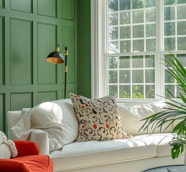 This inviting reading nook features a bold green paneled wall that adds depth and character to the space. The large arched window allows natural light to flood the room, creating a bright and cheerful atmosphere. A comfortable white sofa is adorned with a textured throw pillow, providing a cozy spot for relaxation. The vibrant red armchair introduces a pop of color and complements the green walls beautifully. A black floor lamp and round coffee table complete the setting, making it an ideal corner for reading and unwinding.