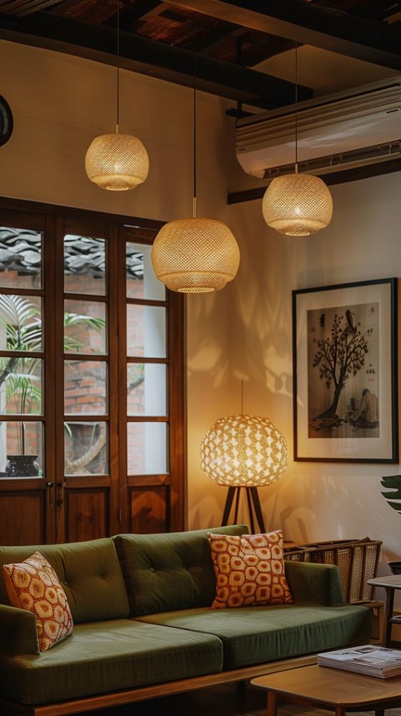 Illuminate your living room with paper lamps featuring intricate patterns. These lamps are made from sustainable materials and provide a soft, ambient light.