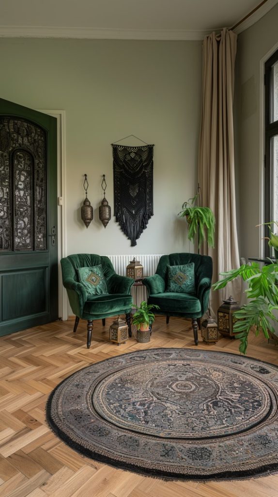 A stylish lounge with green velvet armchairs, a black macramé wall hanging, and ornate lanterns. The room features a patterned round rug, beige curtains, and lush green plants, creating a cozy bohemian vibe.