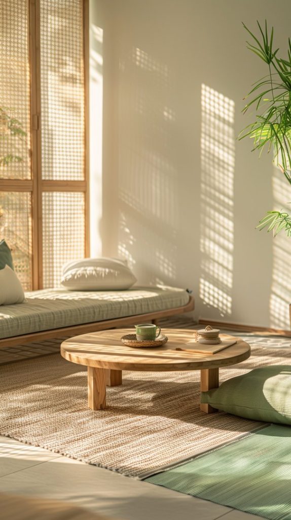 Designate a corner of your living room for meditation, using eco-friendly materials and calming decor. Natural elements like bamboo mats and organic cushions create a serene environment.