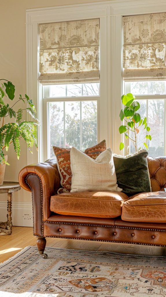 Enhance your windows with vintage fabric treatments. These repurposed materials add a touch of history and sustainability to your living space.