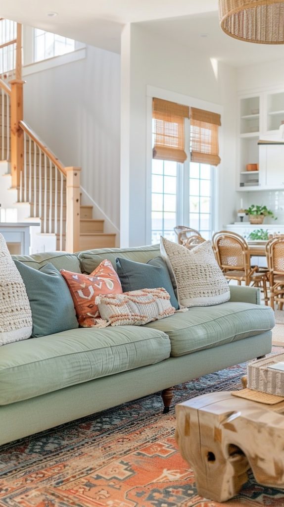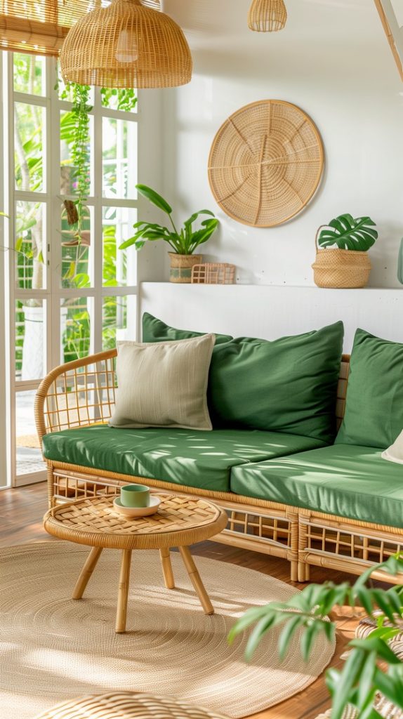 Create a tropical paradise in your living room with lush greenery, bamboo furniture, and vibrant, eco-friendly decor. The use of organic fabrics and natural textures brings the essence of the tropics indoors.