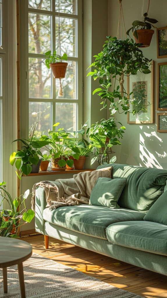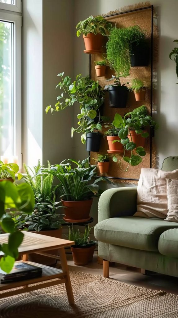 Add hanging pots with lush green plants to create a vertical garden indoors. This setup maximizes space and brings a fresh, natural vibe to your living room.