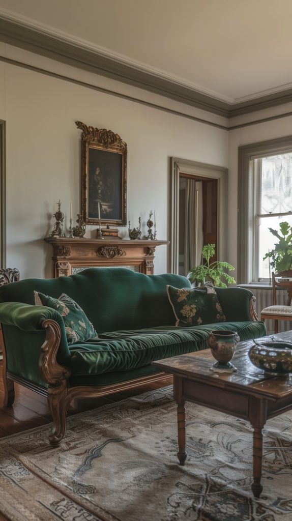 Integrate antique fixtures and furniture to add character and sustainability to your living room. These timeless pieces reduce waste and bring historical charm.