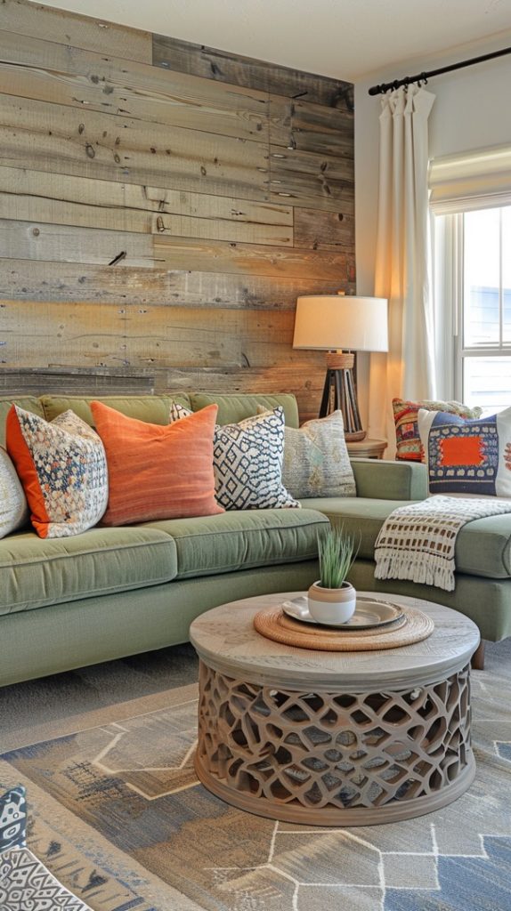 Green Living Room Featuring Reclaimed Wood Wall Decor