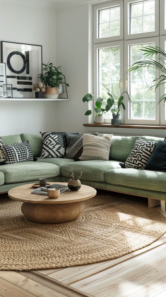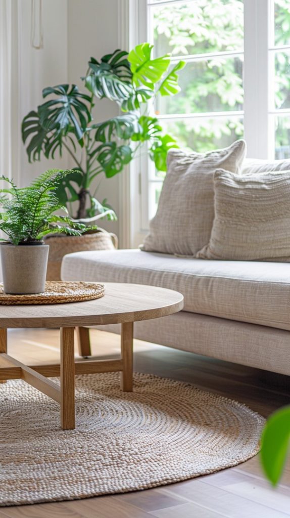 A natural fiber rug made from jute provides a stunning centerpiece. Jute is a biodegradable material that adds warmth and texture to your eco-friendly living room.