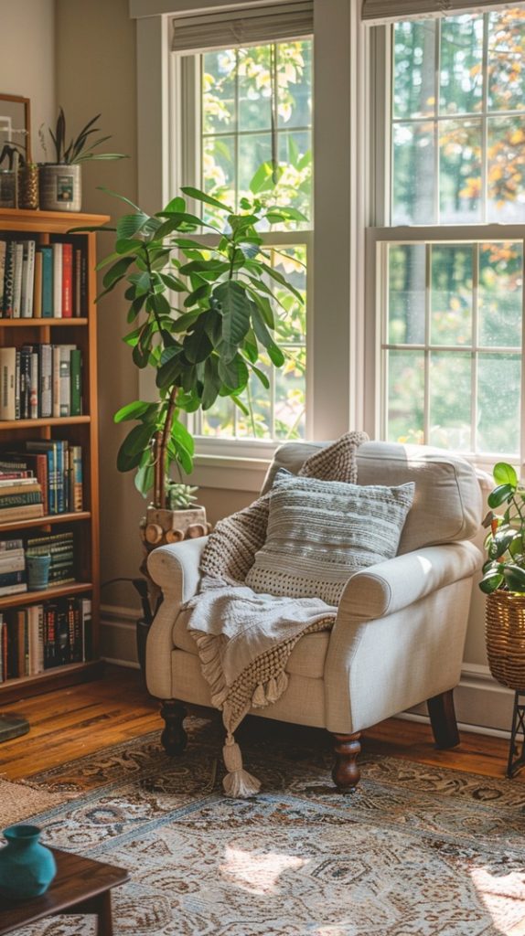 Design a cozy space using sustainable materials such as reclaimed wood, organic fabrics, and recycled decor. This approach ensures a comfortable and environmentally friendly living area.