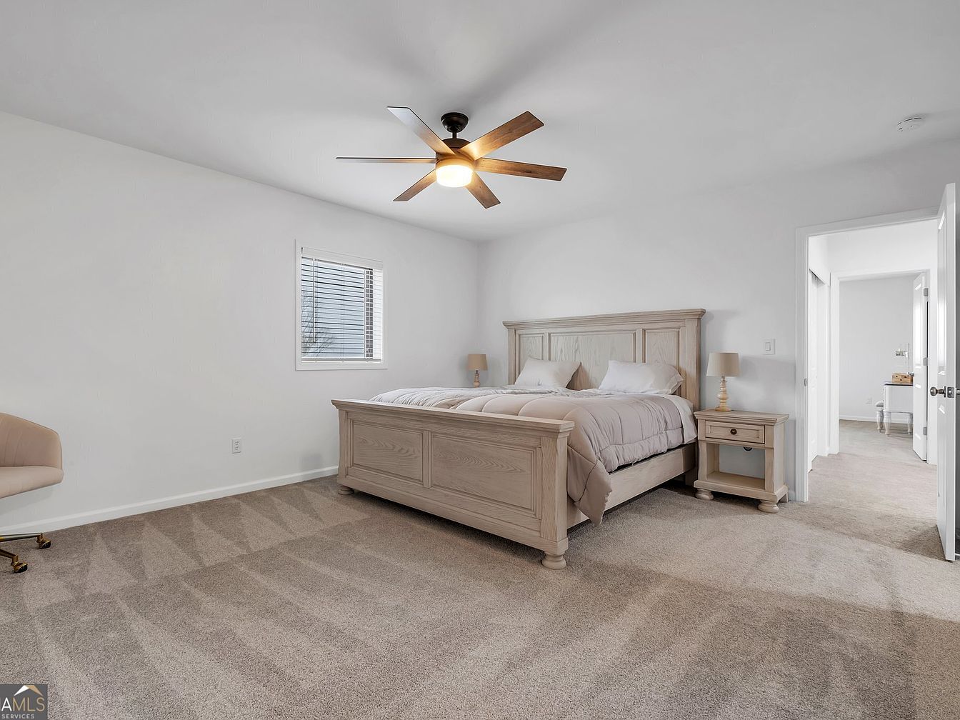 This master bedroom exudes serenity with a palette of whites and light woods. The spacious layout accommodates easy movement, featuring a wooden bed framed by matching nightstands. Subtle hues in the bedding complement the light-colored carpet, creating a cozy atmosphere. A ceiling fan enhances airflow while contributing a modern touch. Natural light fills the room through a window, highlighting the textures. Family-friendly features include ample space for rest and a small seating area.