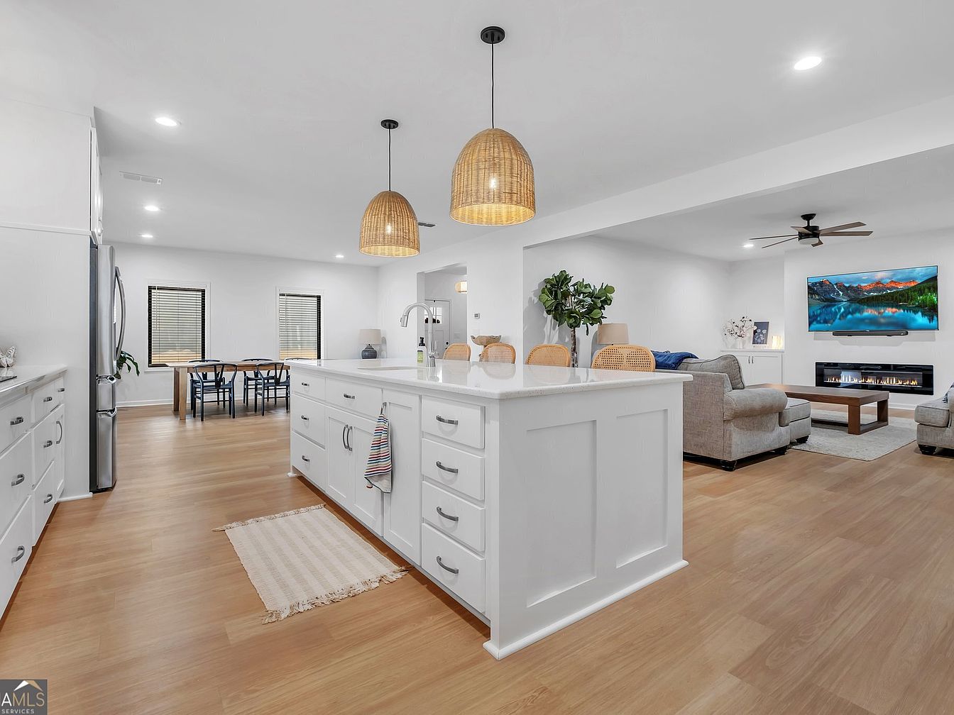 This open-concept space merges practicality with visual appeal, making it ideal for gatherings. White cabinetry and quartz countertops contribute a contemporary vibe, accented by warm wood touches. Rattan pendant lights above the island provide ambient illumination, while plush seating in the living area invites relaxation. A neutral palette with touches of greenery and abundant natural light from large windows creates a bright, welcoming atmosphere.