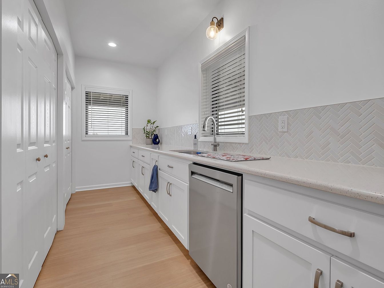 The kitchen is thoughtfully designed with a clean, modern aesthetic, featuring abundant white cabinetry and sleek countertops. Natural light highlights the warmth of wood-like flooring and the subtle, herringbone backsplash. Double doors reveal extra storage, making it practical for busy families. A stainless-steel dishwasher adds a contemporary touch, while a tasteful vase introduces a splash of color.