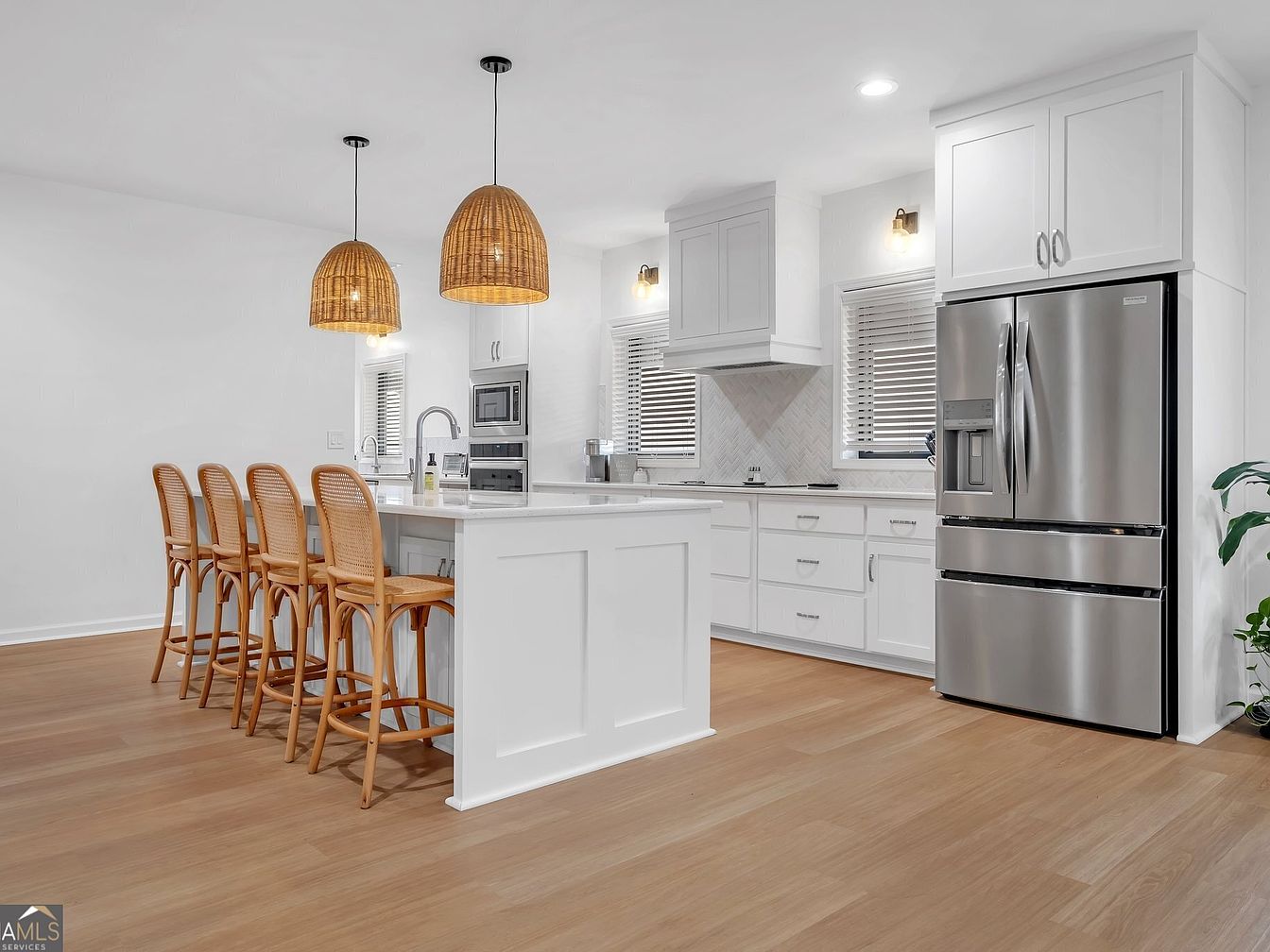 The contemporary culinary space features a roomy layout with high ceilings that enhance the open feel. A large island with a sleek surface offers ample prep room and a gathering focal point. Woven rattan pendant lights hang overhead, providing a warm, inviting vibe. White cabinetry pairs with stainless appliances, including a conveniently accessible refrigerator. Natural light washes over warm wood floors and a subtle herringbone backsplash. Bar stools invite casual dining and everyday togetherness.