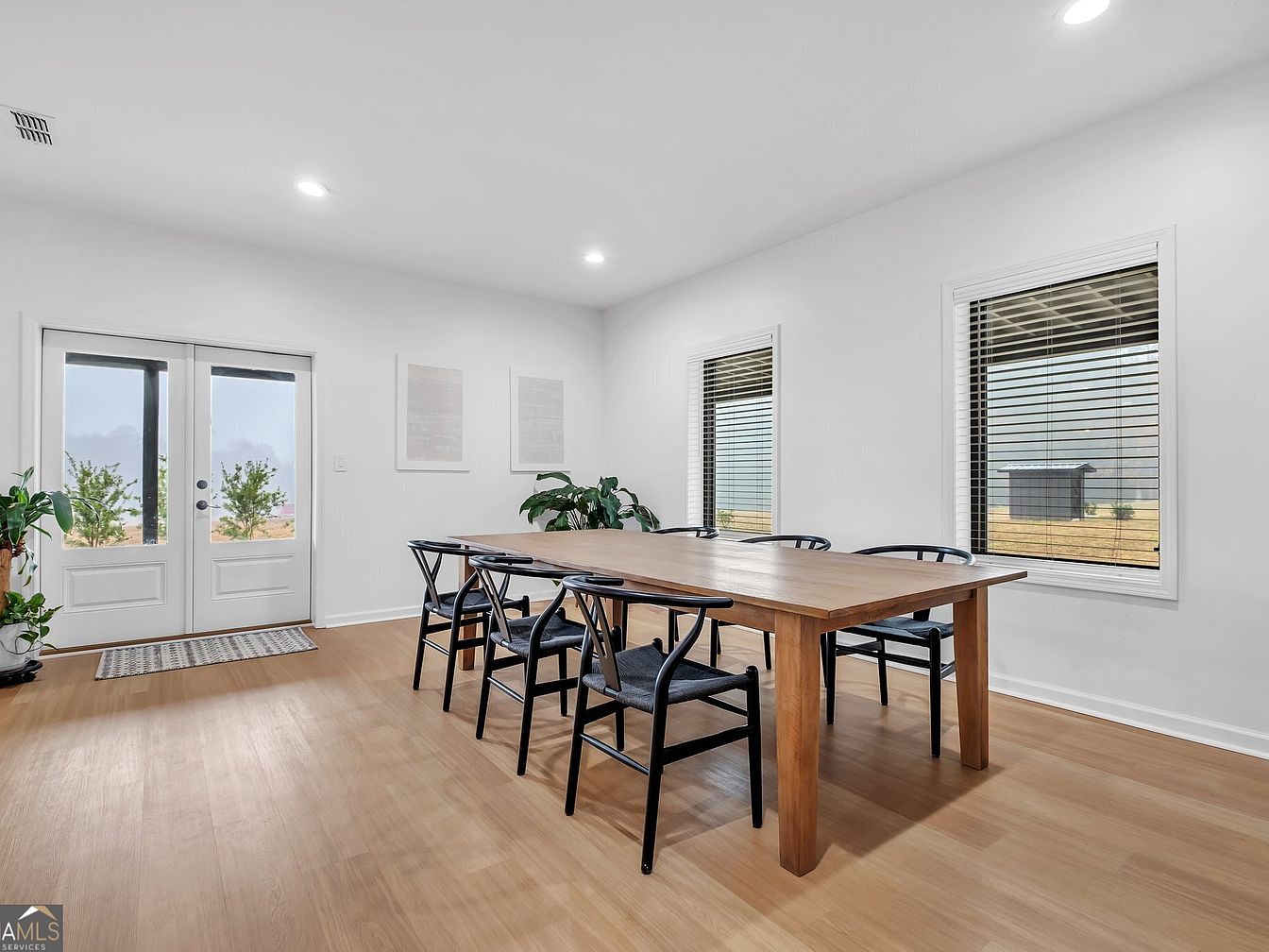 Bright and inviting, this dining area centers around a spacious wooden table paired with sleek black chairs, perfect for family meals. Abundant natural light streams through expansive windows, with views of the landscaped outdoors. A decorative rug adds warmth beneath the table, while light hardwood floors and clean white walls create a modern yet cozy ambiance. Double French doors open to a patio, linking indoor and outdoor living.