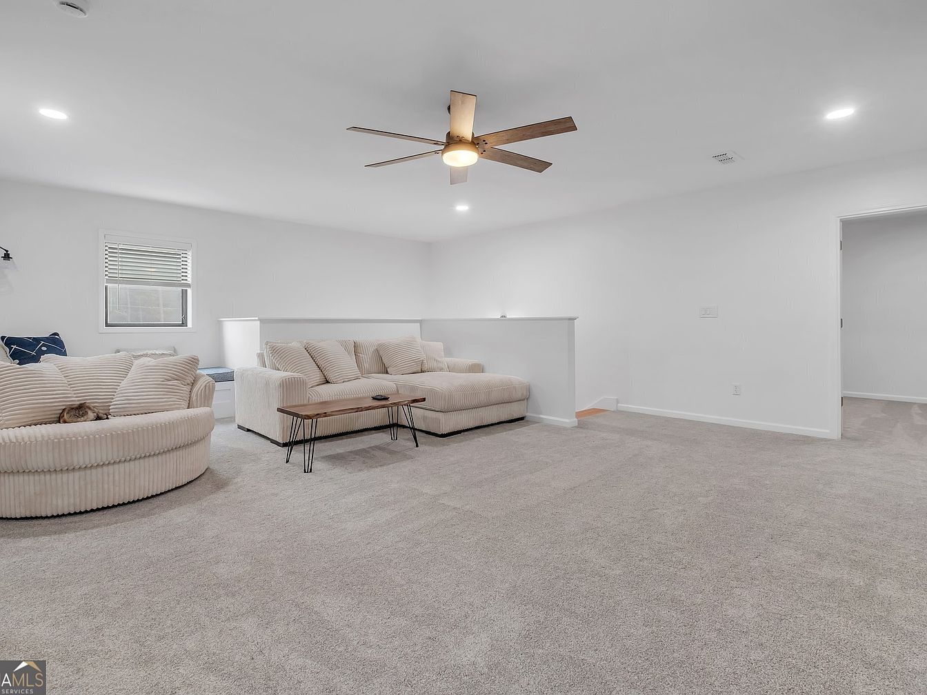 An expansive living room emphasizes comfort and elegance, featuring a soft neutral palette that enhances the sense of space. Plush, oversized sofas provide ample seating for family gatherings or movie nights. The open layout invites easy movement, while a lightly textured carpet adds warmth. A wooden coffee table anchors the space, contrasting with the soft furnishings. Large windows invite natural light, with recessed lighting and a ceiling fan ensuring a bright, airy atmosphere that welcomes friends and family.