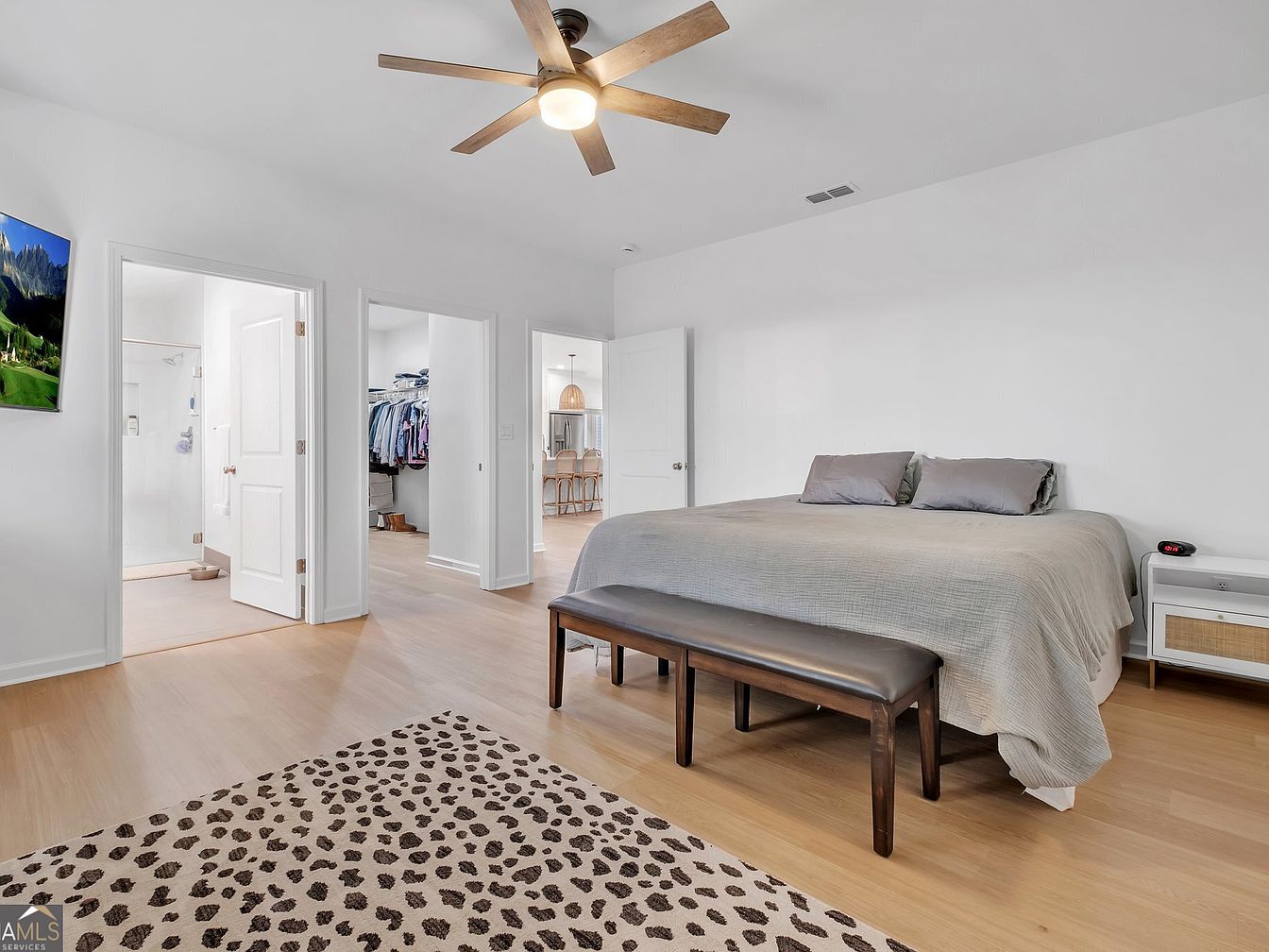 The serene primary suite offers a minimalist vibe with soft neutrals that calm the senses. A plush king bed is paired with stylish nightstands. A modern wooden ceiling fan ensures year-round comfort. Multiple doorways, including a walk-in closet and a private en-suite, provide a seamless flow. Light wood flooring adds warmth, complemented by a textured area rug. This family-friendly retreat balances aesthetics with practicality, offering space to unwind.