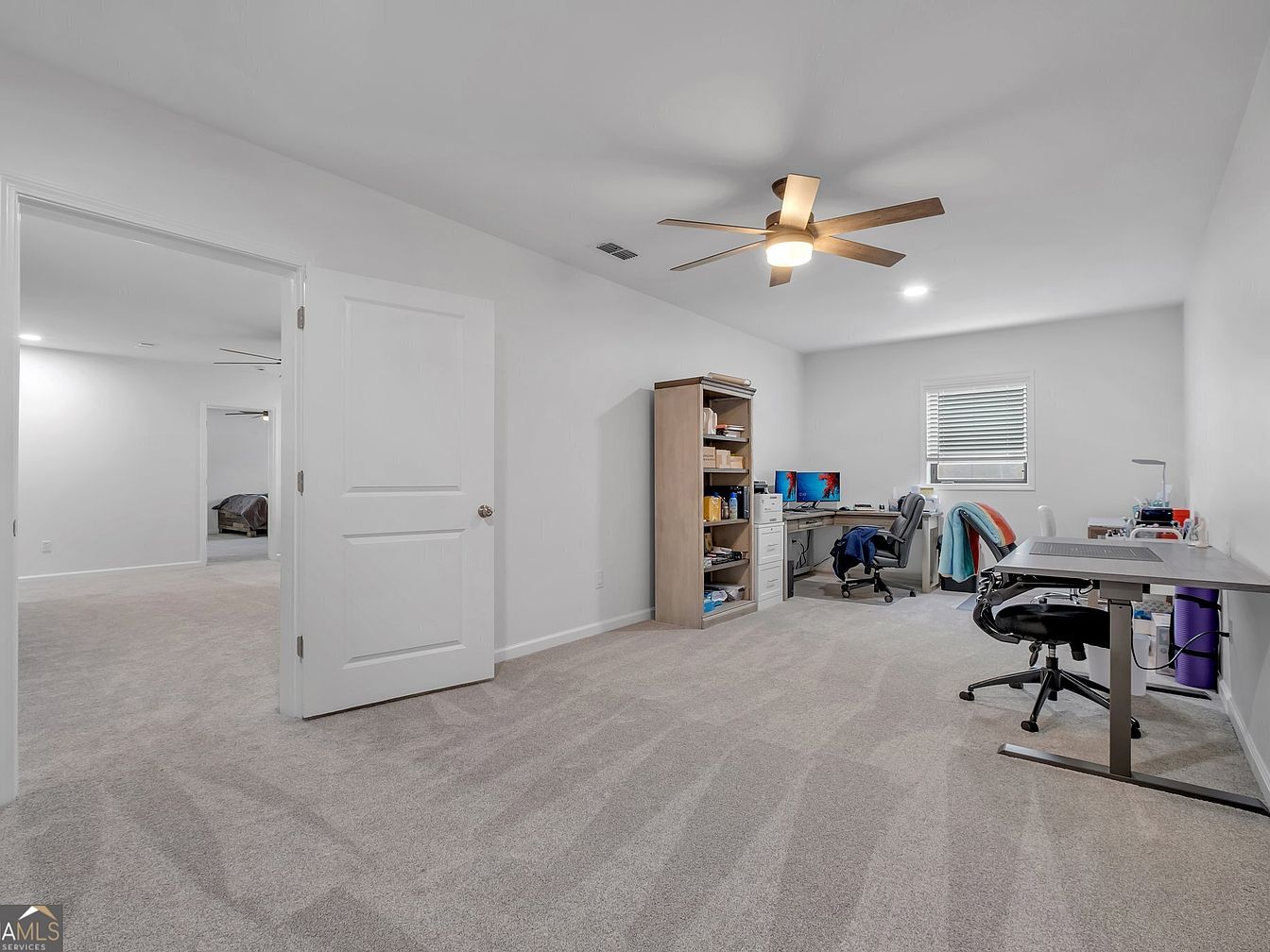 This versatile work area blends practicality with comfort. Neutral walls and plush carpeting create a cozy setting. A stylish ceiling fan adds a refined touch while keeping the space comfortable. A sleek desk and ergonomic chairs support productivity, along with a modern shelving unit that enhances storage. Natural light from the window brightens the room, offering a welcoming atmosphere for work and study in a modern, family-friendly home.