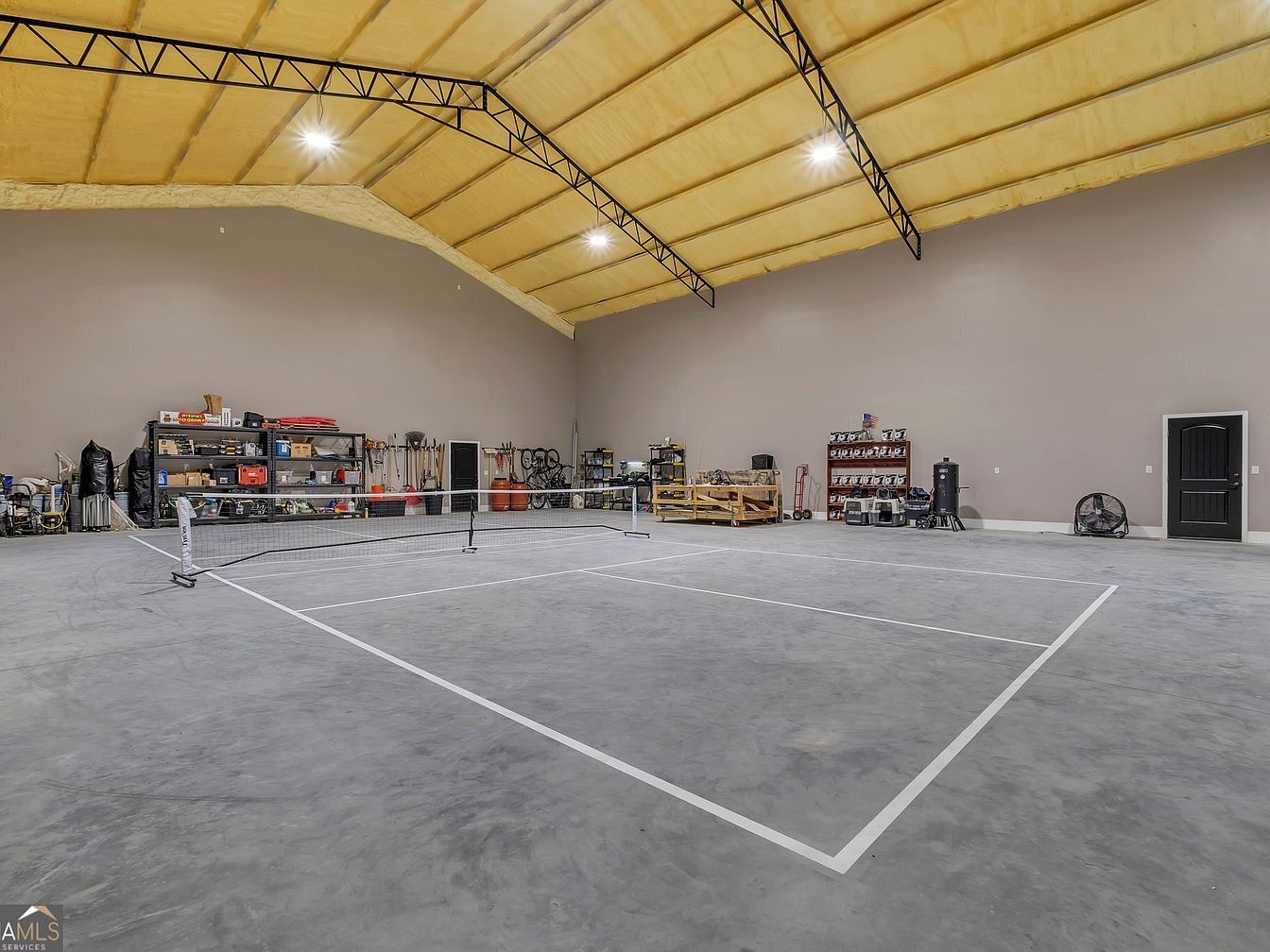 The gymnasium-style space offers a generous layout with a tall, vaulted ceiling and soft yellow insulation that contributes to a warm ambiance. The polished concrete floor accommodates a range of activities, with a net suited for tennis or similar sports. Walls in a neutral tone and built-in storage along the sides highlight practicality, while ample overhead lighting ensures safety and visibility, and the open design fosters freedom of movement.