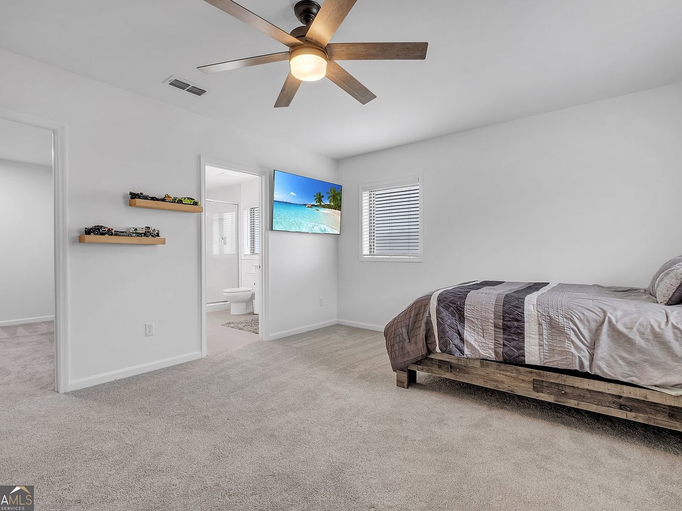 This master suite radiates calm with a whites-and-earth-tones palette. Plush beige carpeting adds warmth, while a modern ceiling fan provides practical elegance. A bed in a deep brown duvet is paired with white furnishings and a slim bedside table. A wall-mounted TV remains easily visible from the bed. Natural light from a nearby window brightens the room, emphasizing its airy feel. Family-friendly design offers ample space for relaxation and seating.