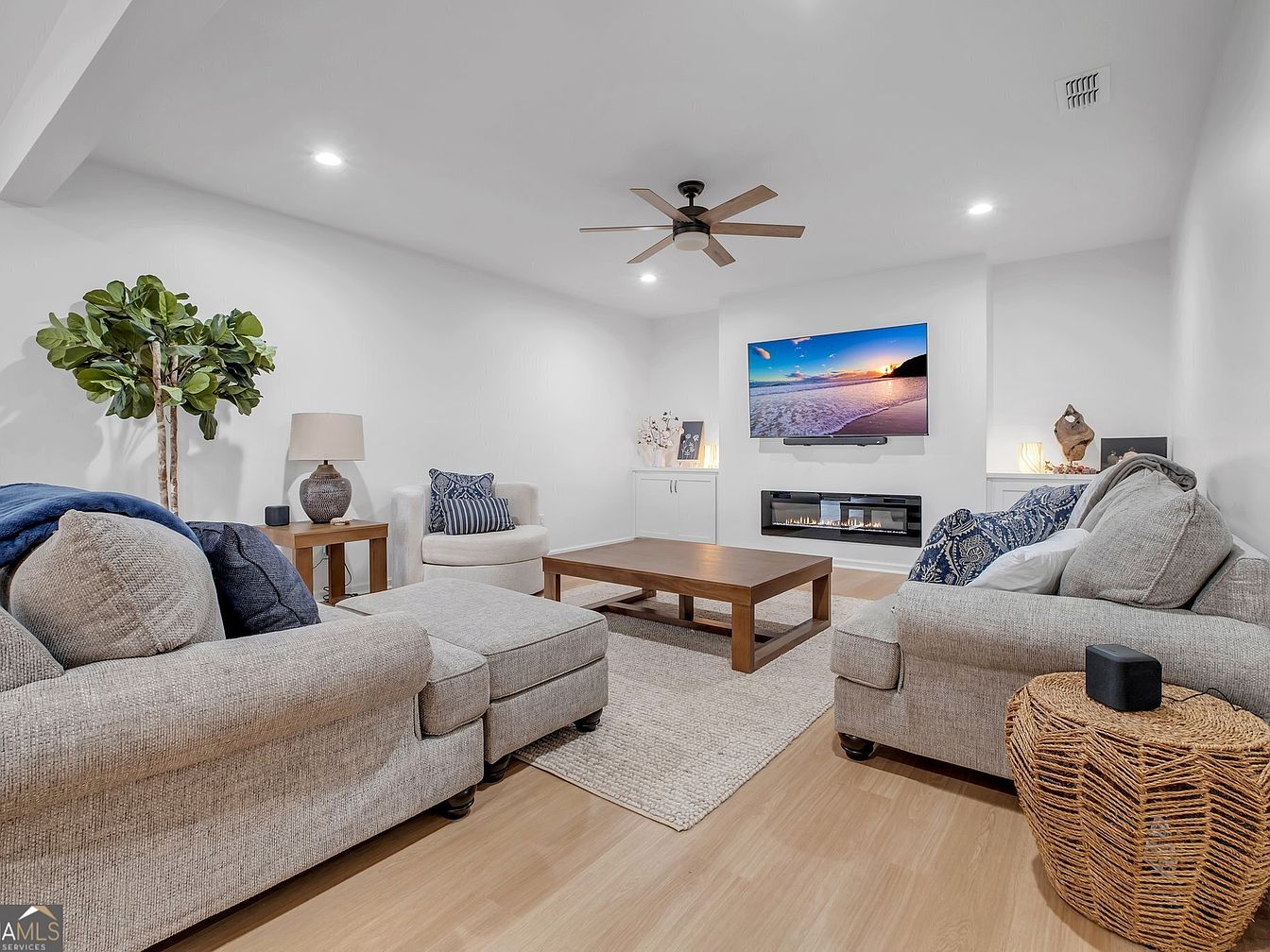 An inviting living area emphasizes comfort with a balanced, airy layout. Soft gray sofas rest atop a warm wood coffee table, complemented by a large area rug. Blue and white accents evoke a coastal feel, while a modern entertainment unit hosts a TV, above which a beach-themed artwork adds character and ambient lighting. A faux plant and woven side table introduce natural texture, making the space family-friendly and perfect for gatherings.