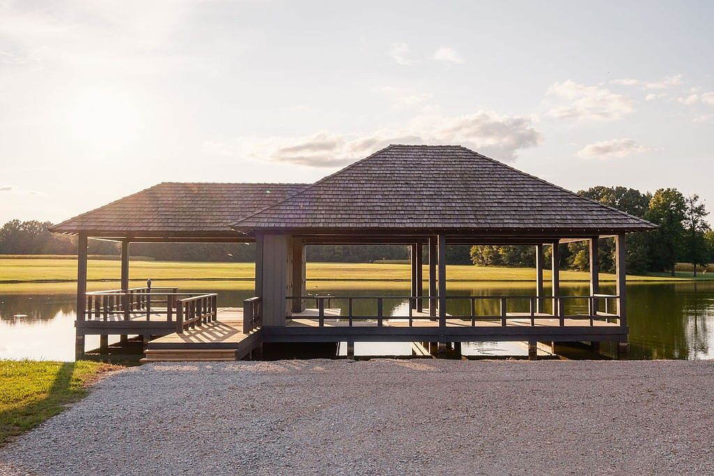 A charming lakeside pavilion extends over the water, crafted with wooden railings and an inviting open design perfect for families to gather. The structure features two large, pitched roofs that provide plenty of shaded outdoor space for socializing, relaxing, or enjoying a peaceful afternoon by the lake. Wide steps lead from a gravel driveway to the dock, ensuring easy access for all ages. Surrounded by calm water and lush green fields, this space is ideal for picnics, play, and outdoor activities, creating a safe and welcoming environment with uninterrupted views of nature. Neutral wood tones blend seamlessly with the tranquil setting.