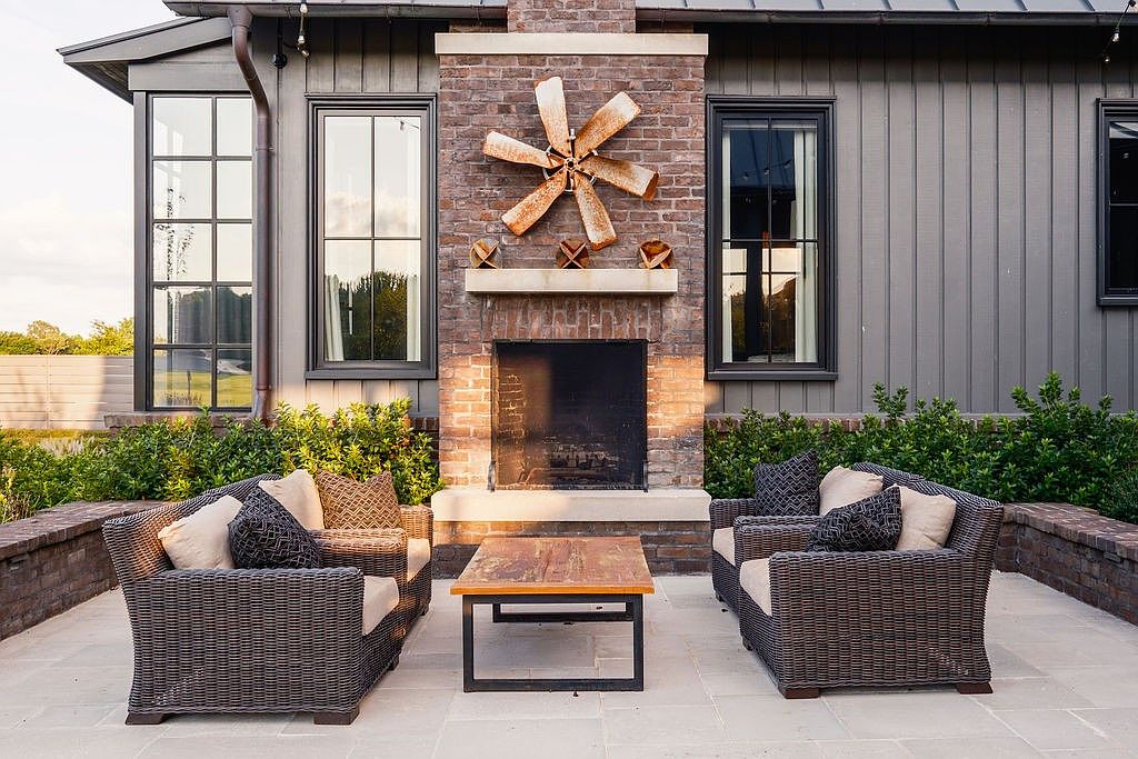 A welcoming outdoor patio features a central brick fireplace, perfect for family gatherings and cozy evenings. Surrounding the fireplace are two matching wicker sofas and two matching armchairs, all fitted with plush cream and charcoal throw pillows for added comfort. The patio is bordered by low red-brick seating walls and lush green shrubs that provide privacy and a touch of nature. Gray, vertical shiplap siding and black-trimmed windows give the exterior a modern farmhouse look, while a wood and metal windmill decor above the fireplace adds rustic charm. The stone tile flooring is both elegant and durable for family use.