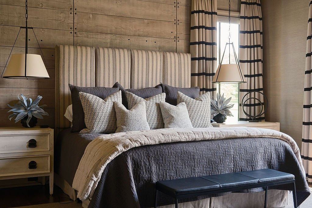 A cozy and welcoming bedroom designed for family comfort, featuring a large, upholstered bed with a tall, vertically striped headboard as the focal point. The bedding is layered in shades of taupe, gray, and cream, topped with an assortment of plush, patterned pillows for added softness and warmth. Nightstands on either side of the bed hold potted succulents, adding a fresh, natural touch and easy-care greenery, while chic hanging lamps offer a modern twist and clutter-free lighting. Floor-to-ceiling windows dressed in elegant, striped drapes let in ample daylight, creating a bright yet restful retreat perfect for a family home.