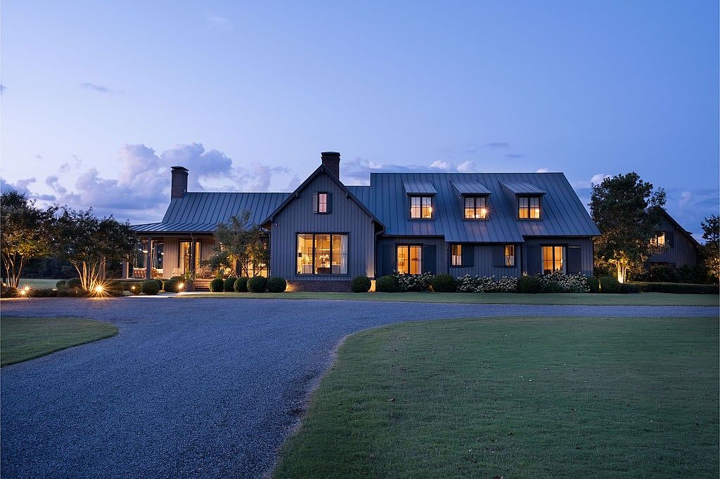 A spacious, inviting American home sits elegantly on a large, well-manicured lawn, perfect for family activities and outdoor play. The two-story house features a classic farmhouse design with a modern twist, boasting a blue-grey metal roof and matching siding. Warm lights glow from numerous generously sized windows, suggesting welcoming interiors. Mature trees and neatly trimmed hedges provide privacy and enhance curb appeal, while a wide circular gravel driveway adds convenience for multiple vehicles. The symmetrical layout, covered porch area, and landscaped garden beds create an aesthetic of comfort, safety, and functionality ideal for family living.