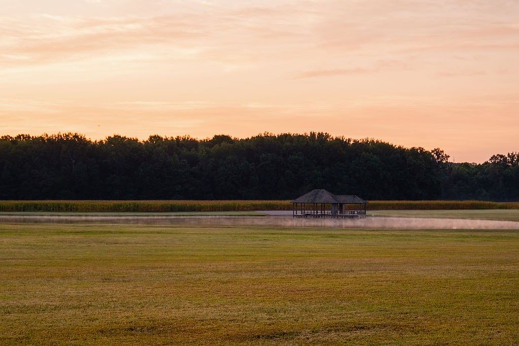 Expansive backyard with a lush, open grassy lawn leading up to a serene pond, perfect for children to play or for outdoor family gatherings. In the center of the pond, a charming wooden pavilion with a gabled roof provides a shaded spot for relaxation, picnics, or fishing. The landscape is framed by tall, mature trees along the horizon, offering privacy and a natural backdrop. The warm tones of a sunrise or sunset create a peaceful ambiance, with soft pink and orange hues in the sky. This scenic space encourages outdoor enjoyment and a quiet, family-friendly atmosphere.