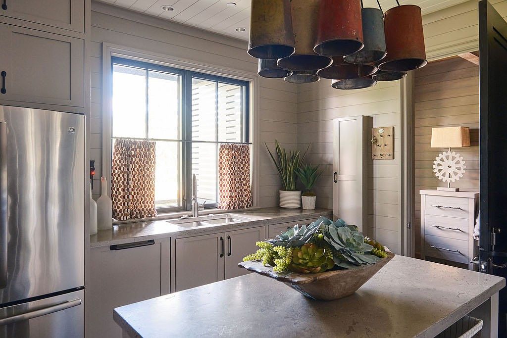 This cozy kitchen features a spacious stone countertop island at the center, perfect for family gatherings or meal preparation. The palette is warm and neutral, with cream-toned cabinetry and brushed stainless-steel appliances adding a modern touch. A large window above the double sink brings in natural light, partially shaded by patterned fabric curtains for privacy. Decorative touches include potted plants and a distinctive arrangement of succulents on the island, creating a welcoming atmosphere. Overhead, a unique rustic chandelier made from colorful metal buckets adds playful character, making the kitchen both stylish and functional for all family members.