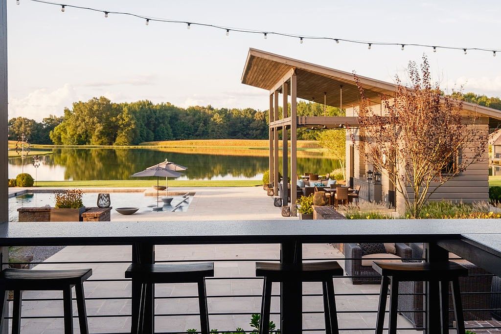 A spacious covered outdoor patio overlooks a serene lake surrounded by lush trees, creating an inviting entertainment area perfect for families. The patio features a modern bar counter with several sleek barstools in dark finishes, ideal for gatherings or casual meals. Comfortable patio seating with weather-resistant wicker furniture sits adjacent to blooming landscaped beds and a neatly paved floor. String lights are draped overhead, adding a festive atmosphere for evening relaxation. Nearby, a large umbrella provides shade for a dining table beside the sparkling pool, making this space ideal for children and adults to play, relax, or enjoy meals together in a peaceful natural setting.