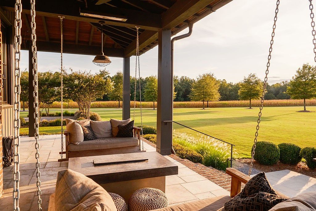 Inviting back porch with a cozy swing bench and plush, earth-toned cushions, perfect for family relaxation and enjoying the outdoors. The spacious porch features shaded areas under a dark-beamed roof, with large sturdy metal chains supporting the swings, and decorative throw pillows adding warmth. A rectangular fire table creates a comfortable gathering spot for evening conversations. The porch overlooks a beautifully manicured lawn bordered by trimmed bushes and mature trees, providing ample space for children to play. Natural stone flooring and soft, neutral colors enhance a serene, welcoming ambiance, making this an ideal setting for both quiet mornings and lively family gatherings.