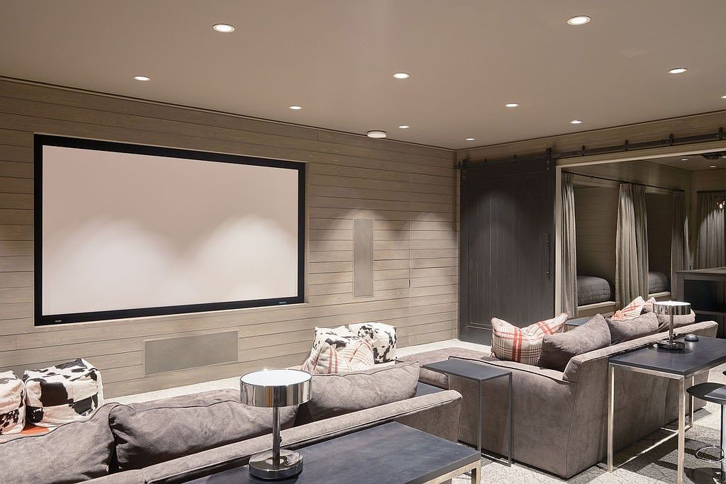 A cozy home theater room features a large projection screen framed by wood-paneled walls painted in soothing taupe tones. Spacious, plush gray sectional sofas are arranged in two rows, inviting the whole family to gather comfortably for movie nights. Throw pillows in plaid and animal prints add a casual and playful touch. Modern black side tables with sleek lamps sit conveniently between seating areas. The room is illuminated by recessed ceiling lights, creating an inviting ambiance. To the side, a sliding barn-style door with curtain-lined alcove leads to a separate, private nook, offering additional seating and a flexible family-friendly space.